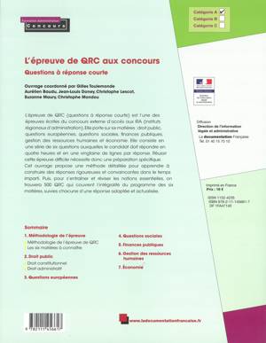 L'épreuve de QRC (questions à réponse courte) est l'une des épreuves écrites du concours externe d'accès aux IRA (instituts régionaux d'administration). Elle porte sur six matières : droit public, questions européennes, questions sociales, finances publiques, gestion des ressources humaines et économie. Elle consiste en une série de six questions auxquelles le candidat doit répondre en quatre heures et en une vingtaine de lignes par réponse. Réussir cette épreuve difficile nécessite donc une préparation spécifique. Cet ouvrage propose une méthode détaillée pour apprendre à construire des réponses rigoureuses et convaincantes dans le temps imparti. Puis, pour s'entraîner et réviser les notions essentielles, on trouvera 500 QRC qui couvrent l'intégralité du programme des six matières, suivies chacune d'une réponse adaptée et actualisée.