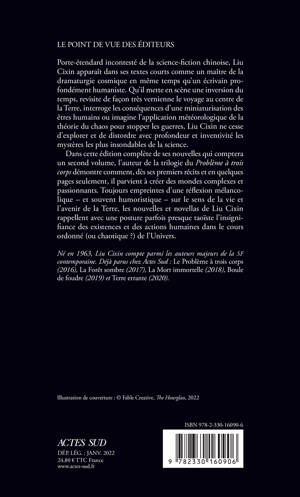 Porte-étendard incontesté de la science-fiction chinoise, Liu Cixin apparaît dans ses textes courts comme un maître de la dramaturgie cosmique en même temps qu'un écrivain profondément humaniste. Qu'il mette en scène une inversion du temps, revisite de façon très vernienne le voyage au centre de la Terre, interroge les conséquences d'une miniaturisation des êtres humains ou imagine l'application météorologique de la théorie du chaos pour stopper les guerres, Liu Cixin ne cesse d'explorer et de distordre avec profondeur et inventivité les mystères les plus insondables de la science. Dans cette édition complète de ses nouvelles qui comptera un second volume, l'auteur de la trilogie du Problème à trois corps démontre comment, dès ses premiers récits et en quelques pages seulement, il parvient à créer des mondes complexes et passionnants. Toujours empreintes d'une réflexion mélancolique - et souvent humoristique - sur le sens de la vie et l'avenir de la Terre, les nouvelles et novellas de Liu Cixin rappellent avec une posture parfois presque taoïste l'insignifiance des existences et des actions humaines dans le cours ordonné (ou chaotique ?) de l'Univers.