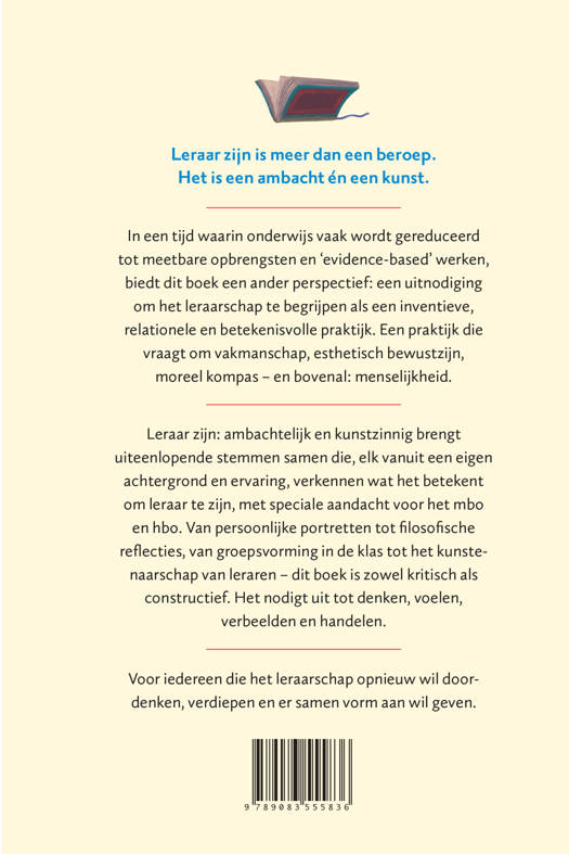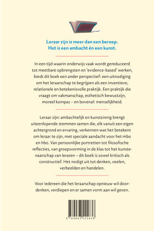 Leraar zijn: ambachtelijk en kunstzinnig brengt uiteenlopende stemmen samen die, elk vanuit een eigen achtergrond en ervaring, verkennen wat het betekent om leraar te zijn, met speciale aandacht voor het mbo en hbo. Van persoonlijke portretten tot filosofische reflecties, van groepsvorming in de klas tot het kunstenaarschap van leraren – dit boek is zowel kritisch als constructief. Het nodigt uit tot denken, voelen, verbeelden en handelen.