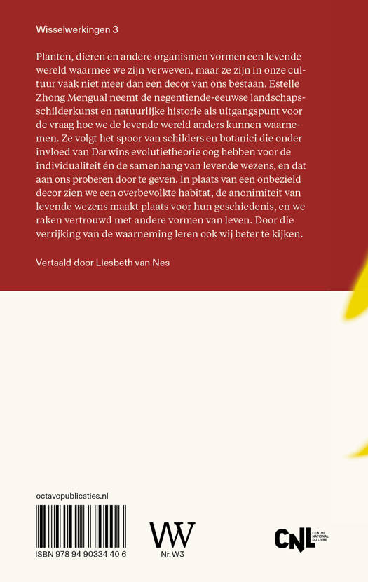 Planten, dieren en andere organismen vormen een levende wereld waarmee we zijn verweven, maar ze zijn in onze cultuur vaak niet meer dan een decor van ons bestaan. Estelle Zhong Mengual neemt de negentiende-eeuwse landschapsschilderkunst en natuurlijke historie als uitgangspunt voor de vraag hoe we de levende wereld anders kunnen waarnemen. Ze volgt het spoor van schilders en botanici die onder invloed van Darwins evolutietheorie oog hebben voor de individualiteit én de samenhang van levende wezens, en dat aan ons proberen door te geven. In plaats van een onbezield decor zien we een overbevolkte habitat, de anonimiteit van levende wezens maakt plaats voor hun geschiedenis, en we raken vertrouwd met andere vormen van leven. Door die verrijking van de waarneming leren ook wij beter te kijken.