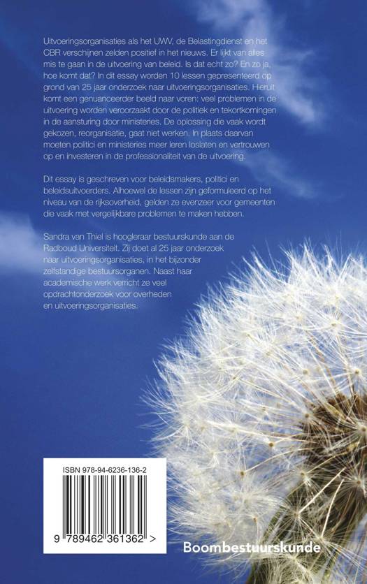 Uitvoeringsorganisaties als het UWV, de Belastingdienst en het CBR verschijnen zelden positief in het nieuws. Er lijkt van alles mis te gaan in de uitvoering van beleid. Is dat echt zo? En zo ja, hoe komt dat? In dit essay worden 10 lessen gepresenteerd op grond van 25 jaar onderzoek naar uitvoeringsorganisaties. Hieruit komt een genuanceerder beeld naar voren: veel problemen in de uitvoering worden veroorzaakt door de politiek en tekortkomingen in de aansturing door ministeries. De oplossing die vaak wordt gekozen, reorganisatie, gaat niet werken. In plaats daarvan moeten politici en ministeries meer leren loslaten en vertrouwen op en investeren in de professionaliteit van de uitvoering.