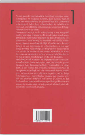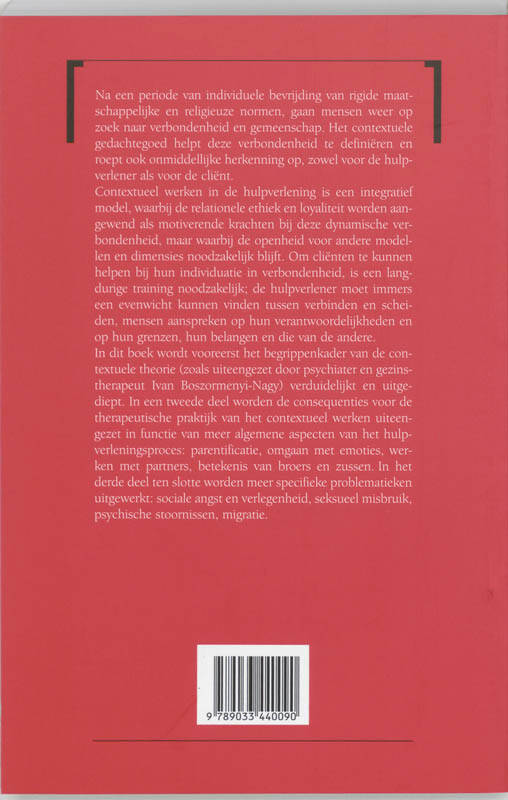 Na een periode van individuele bevrijding van rigide maatschappelijke en religieuze normen, gaan mensen weer op zoek naar verbondenheid en gemeenschap. Het contextuele gedachtegoed helpt deze verbondenheid te definiëren en roept ook onmiddellijke herkenning op, zowel voor de hulpverlener als voor de cliënt. Contextueel werken in de hulpverlening is een integratief model, waarbij de relationele ethiek en loyaliteit worden aangewend als motiverende krachten bij deze dynamische verbondenheid, maar waarbij de openheid voor andere modellen en dimensies noodzakelijk blijft. Om cliënten te kunnen helpen bij hun individuatie in verbondenheid, is een langdurige training noodzakelijk: de hulpverlener moet immers een evenwicht kunnen vinden tussen verbinden en scheiden, mensen aanspreken op hun verantwoordelijkheden en op hun grenzen, hun belangen en die van de andere. In dit boek wordt met name het begrippenkader van de contextuele theorie (zoals uiteengezet door psychiater en gezinstherapeut Ivan Boszormenyi-Nagy) verduidelijkt en uitgediept. In een tweede deel worden de consequenties voor de therapeutische praktijk van het contextueel werken uiteengezet in functie van meer algemene aspecten van het hulpverleningsproces: parentificatie, omgaan met emoties, werken met partners, betekenis van broers en zussen. In het derde deel ten slotte worden meer specifieke problematieken uitgewerkt: sociale angst en verlegenheid, seksueel misbruik, psychische stoornissen, migratie.
