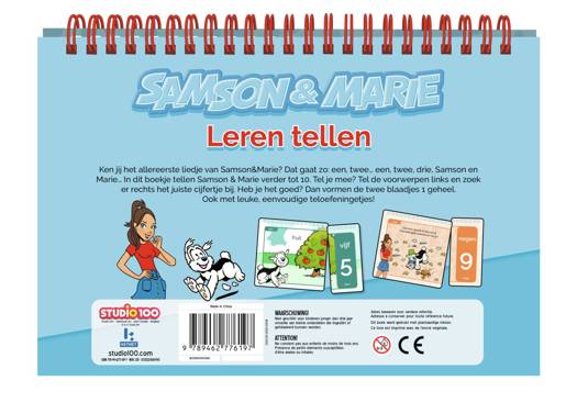 Ken jij het allereerste liedje van Samson&Marie? Dat gaat zo: een, twee… een, twee, drie, Samson en Marie… In dit boekje tellen Samson & Marie verder tot 10. Tel je mee? Tel de voorwerpen links en zoek er rechts het juiste cijfertje bij. Heb je het goed? Dan vormen de twee blaadjes 1 geheel. Ook met leuke, eenvoudige teloefeningetjes!