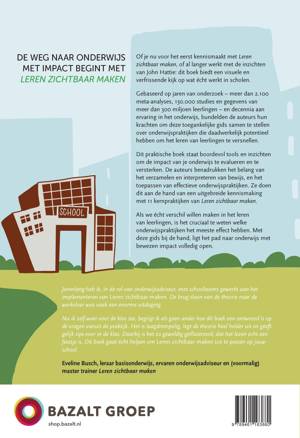 Dit praktische boek staat boordevol tools en inzichten om de impact van je onderwijs te evalueren en te versterken. De auteurs benadrukken het belang van het verzamelen en interpreteren van bewijs, en het toepassen van effectieve onderwijspraktijken. Ze doen dit aan de hand van een uitgebreide kennismaking met 11 kernpraktijken van Leren zichtbaar maken.