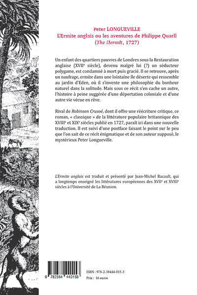 Un enfant des quartiers pauvres de Londres sous la Restauration anglaise (XVIIe siècle), devenu malgré lui (?) un séducteur polygame, est condamné à mort puis gracié. Il se retrouve, après un naufrage, ermite dans une lointaine île déserte qui ressemble au jardin d’Éden, où il s’invente une philosophie du bonheur naturel dans la solitude. Mais sous ce récit s’en cache un autre, l’histoire à peine suggérée d’une déportation coloniale et d’une autre vie vécue en rêve. Rival de Robinson Crusoé, dont il offre une réécriture critique, ce roman, « classique » de la littérature populaire britannique des XVIIIe et XIXe siècles publié en 1727, paraît ici dans une nouvelle traduction. Il est suivi d’une postface faisant le point sur le peu que l’on sait de ce récit énigmatique et de son auteur supposé, le mystérieux Peter Longueville.