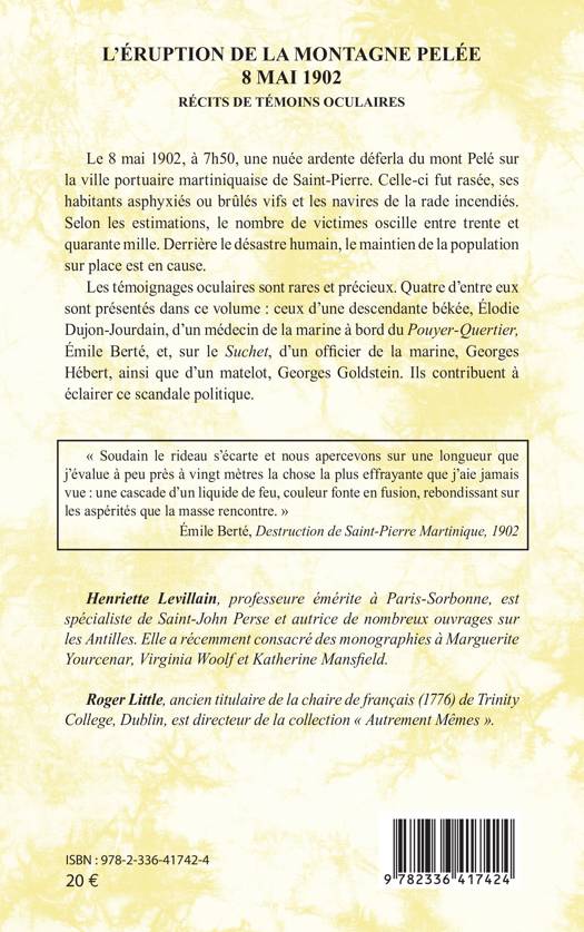 Le 8 mai 1902, à 7h50, une nuée ardente déferla du mont Pelé sur la ville portuaire martiniquaise de Saint-Pierre. Celle-ci fut rasée, ses habitants asphyxiés ou brûlés vifs et les navires de la rade incendiés. Selon les estimations, le nombre de victimes oscille entre trente et quarante mille. Derrière le désastre humain, le maintien de la population sur place est en cause. Les témoignages oculaires sont rares et précieux. Quatre d'entre eux sont présentés dans ce volume: ceux d'une descendante békée, Élodie Dujon-Jourdain, d'un médecin de la marine à bord du Pouyer-Quertier, Émile Berté, et, sur le Suchet, d'un officier de la marine, Georges Hébert, ainsi que d'un matelot, Georges Goldstein. Ils contribuent à éclairer ce scandale politique.