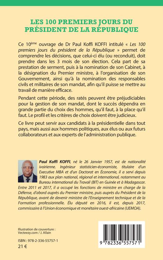 Le 10ème ouvrage de Dr Paul Koffi KOFFI intitulé les 100 premiers jours du président de la République permet de comprendre les décisions, que celui-ci élu (ou reconduit), doit prendre dans les 3 mois de son élection. Cela part de sa prestation de serment, puis à la nomination de son Cabinet, à la désignation du Premier ministre, à l'organisation de son Gouvernement, ainsi qu'à la nomination des responsables civils et militaires de son mandat, afin qu'il puisse se mettre au travail de manière efficace. Pendant cette période, des ratés peuvent être préjudiciables pour la gestion de son mandat, dont le succès dépendra en grande partie du choix des hommes, qu'il faut, à la place qu'il faut. Le profil et les critères de choix doivent être judicieux. Ce livre peut servir aux candidats à la présidentielle dans tout pays, mais aussi aux hommes politiques, aux élus ou aux futurs collaborateurs et aux experts de l'administration publique.