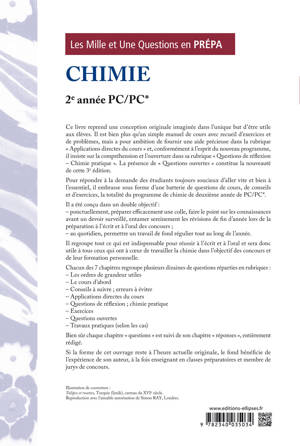 Pour répondre à la demande des étudiants toujours soucieux d’aller vite et bien à l’essentiel, ce livre embrasse sous forme d’une batterie de questions courtes, de conseils et d’exercices, la totalité du programme dechimie de PC/PC*.