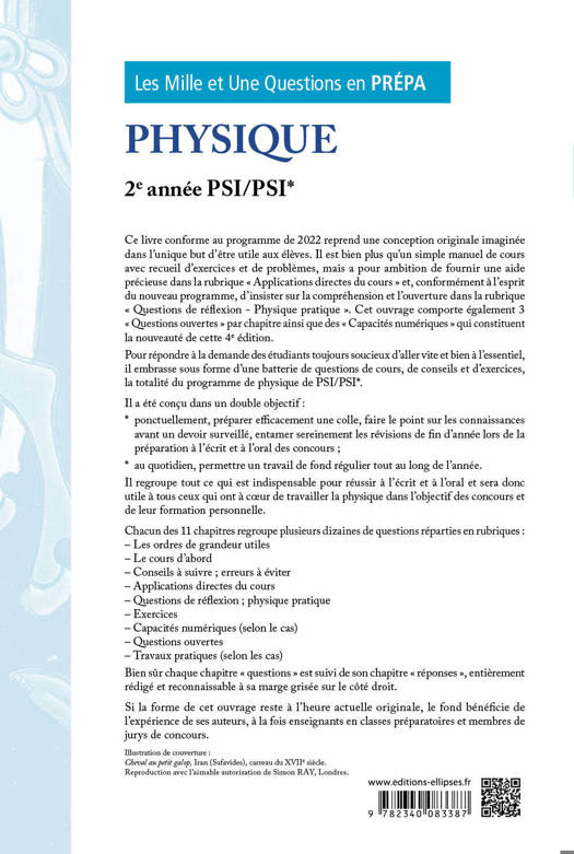 Pour répondre à la demande des étudiants toujours soucieux d’aller vite et bien à l’essentiel, ce livre embrasse sous forme d’une batterie de questions courtes, de conseils et d’exercices, la totalité du programme de physique de 2e année PSI/PSI*.