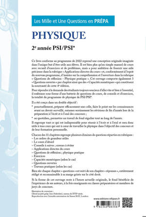 Il regroupe tout ce qui est indispensable pour réussir à l’écrit et à l’oral et sera donc utile à tous ceux qui ont à cœur de travailler la physique dans l’objectif des concours et de leur formation personnelle. Chacun des chapitres regroupe plusieurs dizaines de questions réparties en rubriques :