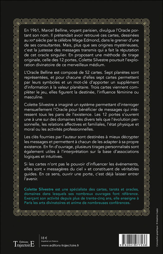 En proposant une méthode de tirage originale, celle des 12 portes, Colette Silvestre poursuit l’exploration divinatoire de ce merveilleux médium qu’est l’Oracle Belline. L’auteure a imaginé un système permettant d’interroger mensuellement l’Oracle pour bénéficier de messages qui intéressent tous les pans de l’existence. Les 12 portes s’ouvrent une à une sur des domaines divers tels que l’évolution personnelle, les relations affectives et familiales, la santé ou les activités professionnelles. Les clés fournies par l’auteure sont destinées à mieux décrypter les messages et permettent à chacun de les adapter à sa propre existence. En fin d’ouvrage, plusieurs tirages personnalisés sont également utiles à l’interprétation sur la base d’associations logiques et intuitives. Si les cartes n’ont pas le pouvoir d’influencer les événements, elles sont « messagères du ciel » et constituent de véritables guides. En ce sens, ouvrir une porte, c’est déjà laisser entrer l’avenir.