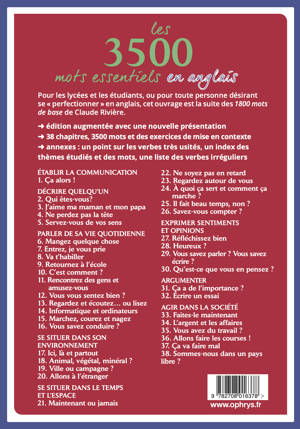 Ces 3500 mots sont destinés aux étudiants de l’anglais qui souhaitent se perfectionner en enrichissant leur vocabulaire de base. Ils couvrent l’essentiel du vocabulaire anglais contemporain, aussi bien dans les principaux domaines techniques (droit, économie, transports, tourisme, etc.) que dans la langue courante (alimentation, vêtement, sports, etc.). Ils sont accompagnés de nombreuses remarques grammaticales et de nouveaux exercices de traduction. TABLE DES MATIERE : Établir la communication. 1. Ça alors ! Décrire quelqu’un. 2. Qui êtes-vous ? 3. J’aime ma maman et mon papa. 4. Ne perdez pas la tête. 5. Servez-vous de vos sens. Parler de sa vie quotidienne. 6. Mangez quelque chose. 7. Entrez, je vous prie. 8. Va t’habiller. 9. Retournez à l’école. 10. C’est comment ? 11. Rencontrez des gens et amusez-vous. 12. Vous vous sentez bien ? 13. Regardez et écoutez… ou lisez. 14. Informatique et ordinateurs. 15. Marchez, courez et nagez. 16. Vous savez conduire ? Se situer dans son environnement. 17. Ici, là et partout. 18. Animal, végétal, minéral ? 19. Ville ou campagne ? 20. Allons à l’étranger. Se situer dans le temps et l’espace. 21. Maintenant ou jamais. 22. Ne soyez pas en retard. 23. Regardez autour de vous. 24. À quoi ça sert et comment ça marche ? 25. Il fait beau temps, non ? 26. Savez-vous compter ? Exprimer sentiments et opinions. 27. Réfléchissez bien. 28. Heureux ? 29. Vous savez parler ? Vous savez écrire ? 30. Qu’est-ce que vous en pensez ? Argumenter. 31. Ça a de l’importance ? 32. Écrire un essai. Agir dans la société. 33. Faites-le maintenant. 34. L’argent et les affaires. 35. Vous avez du travail ? 36. Allons faire les courses ! 37. Ça va faire mal. 38. Sommes-nous dans un pays libre ?