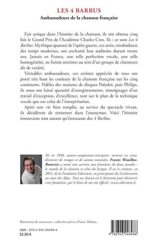 Fait unique dans l’histoire de la chanson, ils ont obtenu cinq fois le Grand Prix de l’Académie Charles Cros. Ils : ce sont Les 4 Barbus. Mythique quatuor de l’après-guerre, ces amis, troubadours des temps modernes, ont enchanté leur auditoire durant trente ans. Jamais en France, une telle perfection vocale, une telle homogénéité, ne furent atteintes au sein d’un groupe de chanteurs dit de variété.