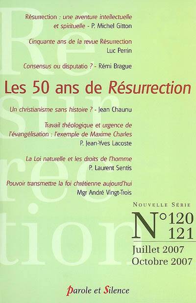 Au sommaire, notamment : Résurrection, une aventure intellectuelle et spirituelle (M. Gitton) ; Cinquante ans de la revue Résurrection (L. Perrin) ; Consensus ou disputatio ? (R. Brague) ; Un christianisme sans histoire ? (J. Chaunu) ; Travail théologique et urgences de l'évangélisation : l'exemple de Maxime Charles (J.-Y. Lacoste) ; La loi naturelle et les droits de l'homme (L. Sentis).