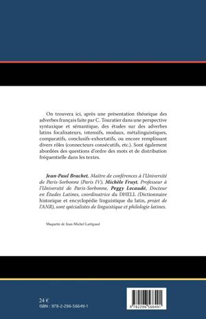 On trouvera ici, après une présentation théorique des adverbes français faite par C. Touratier dans une perspective syntaxique et sémantique, des études sur des adverbes latins focalisateurs, intensifs, modaux, métalinguistiques, comparatifs, conlusifs-exhortatifs, ou encore remplissant divers rôles (connecteurs consécutifs, etc.). Sont également abordées des questions d'ordre des mots et de distribution fréquentielle dans les textes.