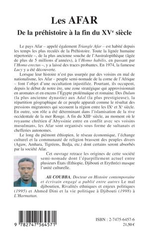 Le pays Afar est habité depuis les temps les plus reculés de la Préhistoire. Son rôle a été déterminant dans l'islamisation de la rive occidentale de la mer Rouge. A la fin du XIIè siècle, au moment où le royaume chrétien d'Abyssinie entre en conflit avec ses voisins musulmans, les Afar sont organisés sous forme de sultanats et chefferies autonomes. Cet ouvrage retrace les origines de cette société semi-nomade dont l'éparpillement entre plusieurs Etats (Ethiopie, Djibouti, Erythrée) masque l'unité culturelle.