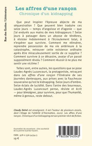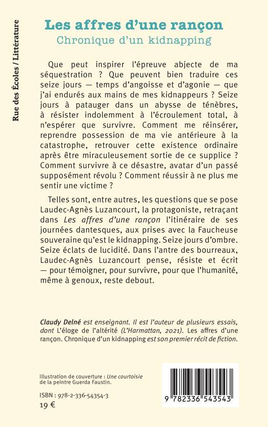 Que peut inspirer l'épreuve abjecte de ma séquestration ? Que peuvent bien traduire ces seize jours - temps d'angoisse et d'agonie - que j'ai endurés aux mains de mes kidnappeurs ? Seize jours à patauger dans un abysse de ténèbres, à résister indolemment à l'écroulement total, à n'espérer que survivre. Comment me réinsérer, reprendre possession de ma vie antérieure à la catastrophe, retrouver cette existence ordinaire après être miraculeusement sortie de ce supplice ? Comment survivre à ce désastre, avatar d'un passé supposément révolu ? Comment réussir à ne plus me sentir une victime ? Telles sont, entre autres, les questions que se pose Laudec-Agnès Luzancourt, la protagoniste, retraçant dans Les affres d'une rançon l'itinéraire de ses journées dantesques, aux prises avec la Faucheuse souveraine qu'est le kidnapping. Seize jours d'ombre. Seize éclats de lucidité. Dans l'antre des bourreaux, Laudec-Agnès Luzancourt pense, résiste et écrit - pour témoigner, pour survivre, pour que l'humanité, même à genoux, reste debout.
