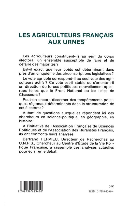 Les agriculteurs constituent-ils au sein du corps électoral un ensemble susceptible de faire et de défaire des majorités? Est-il exact que leur poids est déterminant dans près d'un cinquième des circonscriptions législatives? Le vote agricole correspond-il au seul vote des agriculteurs actifs? Ce vote est-il stable ou s'oriente-t-il en direction de forces politiques nouvellement apparues telles que le Front National ou les listes de Chasseurs? Peut-on encore discerner des tempéraments politiques régionaux déterminants dans la structuration de cet électorat? Autant de questions auxquelles répondent ici des chercheurs en science-politique, en géographie, en histoire ... A l'initiative de l'Association Française de Sciences Politiques et de l'Association des Ruralistes Français, ils ont confronté leurs analyses. Bertrand HERVIEU, Directeur de Recherches au C.N.R.S., Chercheur au Centre d'Étude de la Vie Politique Française, a rassemblé ces analyses actuelles pour éclairer le débat.