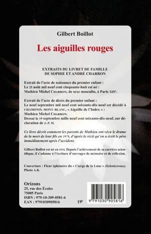 EXTRAITS DU LIVRET DE FAMILLE DE SOPHIE ET ANDRÉ CHARRON Extrait de l'acte de naissance du premier enfant: Le 25 août mil neuf cent cinquante-huit est né Mathieu Michel Charron, de sexe masculin, à Paris XIIIe. Extrait de l'acte de décès du premier enfant: Le neuf septembre mil neuf cent soixante-dix-neuf est décédé à CHAMONIX-MONT-BLANC, Aiguille de l'Index: Mathieu Michel Charron. Dressé le 19 septembre mille neuf cent soixante-dix-neuf, sur dé- claration de J.-P. M. Ce livre décrit comment les parents de Mathieu ont vécu le drame de la mort de leur fils en 1979, d'après le récit qu'en a écrit le père immédiatement après l'accident.