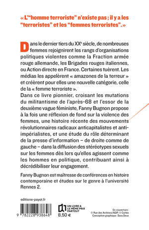 « L'"homme terroriste" n'existe pas ; il y a les "terroristes" et les "femmes terroristes". » Dans le dernier tiers du XXe siècle, de nombreuses femmes rejoignirent les rangs d'organisations politiques violentes comme la Fraction armée rouge allemande, les Brigades rouges italiennes, ou Action directe en France. Certaines tuèrent. Les médias les appelèrent « amazones de la terreur » et créèrent pour elles une nouvelle catégorie, celle de la « femme terroriste ». Dans ce livre pionnier, croisant les mutations du militantisme de l'après-68 et l'essor de la deuxième vague féministe, Fanny Bugnon propose à la fois une réflexion de fond sur la violence des femmes, une histoire récente des mouvements révolutionnaires radicaux a nticapitalistes et anti-impérialistes, et une étude du rôle déterminant de la presse d'information - de droite comme de gauche - dans la diffusion des stéréotypes sexuels sur les femmes dès lors qu'elles agissent comme les hommes en politique, contribuant ainsi à décrédibiliser leur engagement.