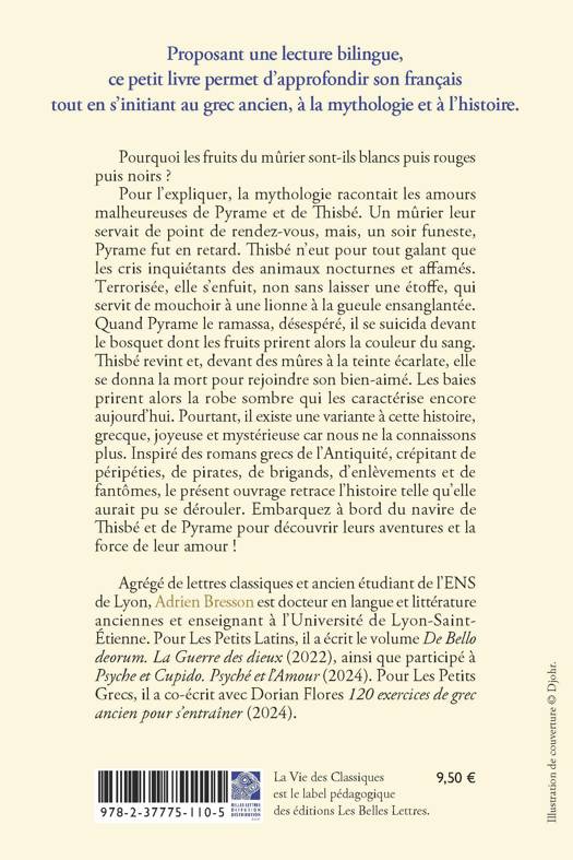 Pourquoi les fruits du mûrier sont-ils blancs puis rouges puis noirs ? Pour l’expliquer, la mythologie racontait les amours malheureuses de Pyrame et de Thisbé. Un mûrier leur servait de point de rendez-vous, mais, un soir funeste, Pyrame fut en retard. Thisbé n’eut pour tout galant que les cris inquiétants des animaux nocturnes et affamés. Terrorisée, elle s’enfuit, non sans laisser une étoffe, qui servit de mouchoir à une lionne à la gueule ensanglantée. Quand Pyrame le ramassa, désespéré, il se suicida devant le bosquet dont les fruits prirent alors la couleur du sang. Thisbé revint et, devant des mûres à la teinte écarlate, elle se donna la mort pour rejoindre son bien-aimé. Les baies prirent alors la robe sombre qui les caractérise encore aujourd’hui. Pourtant, il existe une variante à cette histoire, grecque, joyeuse et mystérieuse car nous ne la connaissons plus. Inspiré des romans grecs de l’Antiquité, crépitant de péripéties, de pirates, de brigands, d’enlèvements et de fantômes, le présent ouvrage retrace l’histoire telle qu’elle aurait pu se dérouler. Embarquez à bord du navire de Thisbé et de Pyrame pour découvrir leurs aventures et la force de leur amour !