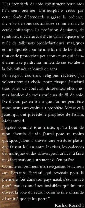 "Les étendards de soie constituent pour moi l'élément premier. L'atmosphère créée par cette forêt d'étendards suggère la présence invisible de tous ces ancêtres comme dans le cercle initiatique. La profusion de signes, de symboles, d'écritures délivre dans l'espace une nuée de talismans prophylactiques, magiques et intemporels comme une forme de bénédiction et de protection pour tous ceux qui viendraient à se perdre au milieu de ces textiles à la fois raffinés et lourds de sens.