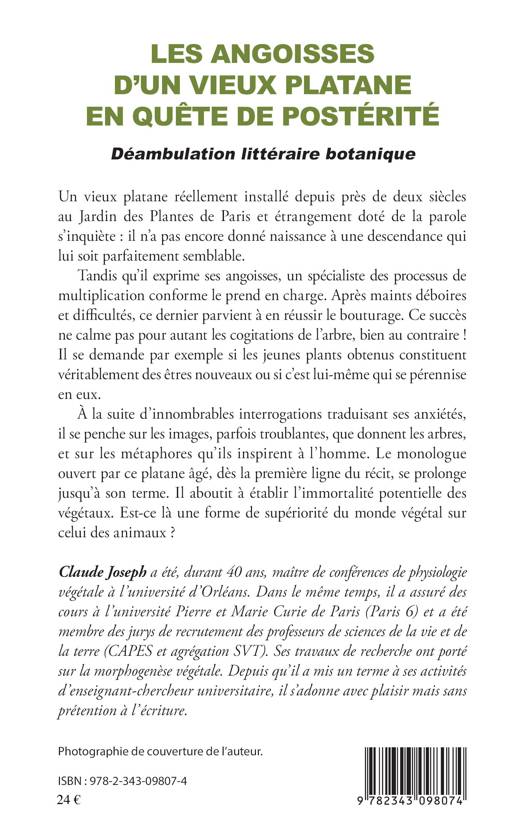 Un vieux platane réellement installé depuis près de deux siècles au Jardin des Plantes de Paris et étrangement doté de la parole s'inquiète : il n'a pas encore donné naissance à une descendance qui lui soit parfaitement semblable. Après maints déboires et difficultés, un spécialiste du processus de multiplication parvient à réussir son bouturage. Ce succès ne calme pas pour autant les cogitations de l'arbre, bien au contraire ! À la suite d'innombrables interrogations traduisant ses anxiétés, il se penche sur les images, parfois troublantes, que donnent les arbres, et sur les métaphores qu'ils inspirent à l'homme.