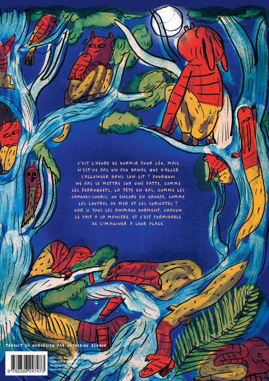 C'est l'heure de dormir pour Léo, mais n'est-ce pas un peu banal que d'aller s'allonger dans son lit ? Pourquoi ne pas se mettre sur une patte, comme les perroquets, la tête en bas, comme les chauves-souris, ou encore en groupe, comme les loutres de mer et les suricates ? Car si tous les animaux dorment, chacun le fait à sa manière. Et c'est formidable de s'imaginer à leur place.
