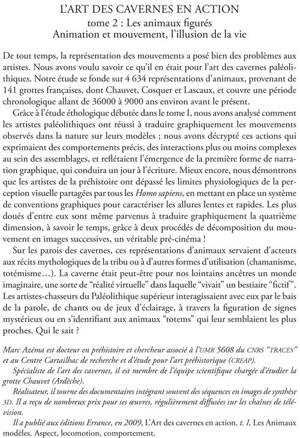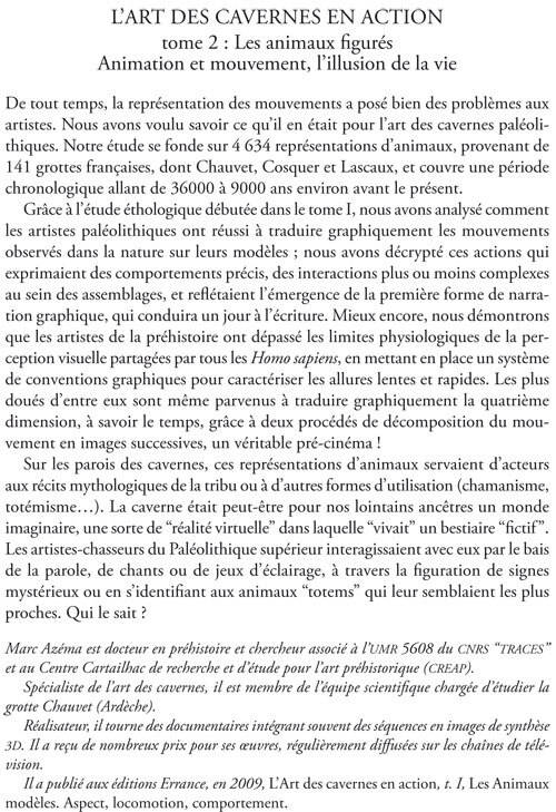 De tout temps, la représentation des mouvements a posé bien des problèmes aux artistes. Nous avons voulu savoir ce qu'il en était pour l'art des cavernes paléolithiques. Notre étude se fonde sur 4 634 représentations d'animaux, provenant de 141 grottes françaises, dont Chauvet, Cosquer et Lascaux, et couvre une période chronologique allant de 36000 à 9000 ans environ avant le présent. Grâce à l'étude éthologique débutée dans le tome I, nous avons analysé comment les artistes paléolithiques ont réussi à traduire graphiquement les mouvements observés dans la nature sur leurs modèles ; nous avons décrypté ces actions qui exprimaient des comportements précis, des interactions plus ou moins complexes au sein des assemblages, et reflétaient l'émergence de la première forme de narration graphique, qui conduira un jour à l'écriture. Mieux encore, nous démontrons que les artistes de la préhistoire ont dépassé les limites physiologiques de la perception visuelle partagées par tous les Homo sapiens, en mettant en place un système de conventions graphiques pour caractériser les allures lentes et rapides. Les plus doués d'entre eux sont même parvenus à traduire graphiquement la quatrième dimension, à savoir le temps, grâce à deux procédés de décomposition du mouvement en images successives, un véritable pré-cinéma ! Sur les parois des cavernes, ces représentations d'animaux servaient d'acteurs aux récits mythologiques de la tribu ou à d'autres formes d'utilisation (chamanisme, totémisme). La caverne était peut-être pour nos lointains ancêtres un monde imaginaire, une sorte de "réalité virtuelle" dans laquelle "vivait" un bestiaire "fictif". Les artistes-chasseurs du Paléolithique supérieur interagissaient avec eux par le bais de la parole, de chants ou de jeux d'éclairage, à travers la figuration de signes mystérieux ou en s'identifiant aux animaux "totems" qui leur semblaient les plus proches. Qui le sait?