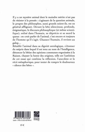 Il y a un mystere animal dont le moindre merite n'est pas de resister a la pensee: s'agissant de la question animale, le propos des philosophes, aussi grands soient-ils, est en general affligeant. Devant la bete silencieuse, profonde, enigma-tique, le discours philosophique (et meme scienti-fique), enlise dans l'humain, se deprecie et se mord la queue: on croit parler de l'animal, c'est encore et toujours de l'homme qu'il s'agit. Chassez l'humain, il revient au galop... Retablir l'animal dans sa dignite ontologique, s'etonner du mepris dans lequel il est tenu au nom de l'Intelligence, denoncer la betise des opinions communes engraissees a la Raison, chasser la honte des origines, telle est l'ambition de cet essai qui combine la reflexion, l'anecdote et le recit metaphorique, pour tenter de rompre le douloureux " silence des betes ".