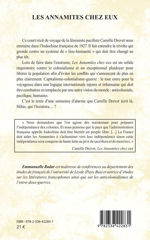 Ce court récit de voyage de la féministe pacifiste Camille Drevet nous emmène dans l'Indochine française de 1927. Il fait entendre la révolte qui gronde contre un système de lèse-humanité qui doit être changé au plus tôt. Loin de faire dans l'exotisme, Les Annamites chez eux est un solide réquisitoire contre le colonialisme et un exceptionnel plaidoyer pour libérer la population afin d'éviter les conflits qui s'annoncent de plus en plus clairement. Capitalisme-colonialisme-guerre: le tout entre pour la voyageuse dans une logique internationale injuste et inhumaine qui doit être combattue et remplacée par une autre vision du monde: anticoloniale, pacifique, humaine. C'est le texte d'une sonneuse d'alarme que Camille Drevet écrit là. Hélas, qui l'écoutera... ?