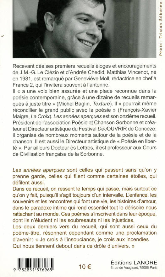 Les années aperçues sont celles qui passent sans qu’on y prenne garde, celles qui filent comme certaines étoiles, qui défilent aussi. Dans ce recueil, on ressent le temps qui passe, mais surtout ce qu’on y fait, puisqu’il s’agit toujours d’un intervalle. L’enfance, les souvenirs et les rencontres qui font une vie, les histoires d’amour, dans le paradoxe intime qui rend essentiel tout le dérisoire nous rattachant au monde. Ces poèmes s’inscrivent dans leur époque, dont ils n’éludent ni les soubresauts ni les injustices. Les deux derniers vers du recueil, qui sont aussi ceux du poème-titre, résonnent cependant comme une proclamation d’avenir : « Je crois à l’insouciance, je crois aux incendies, Qui nous tiennent debout dans ce drôle d’univers ».