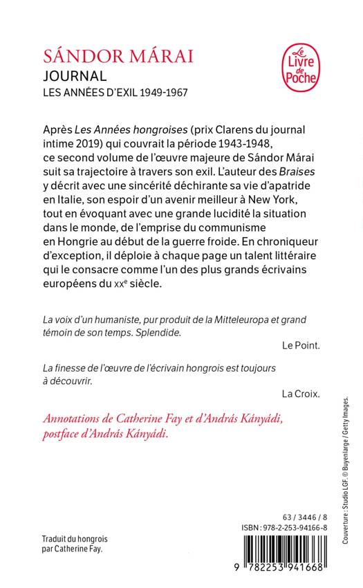 Après Les Années hongroises (prix Clarens du Journal intime 2019) qui couvrait la période 1943-1948, ce second volume de l’œuvre majeure de Sándor Márai suit sa trajectoire à travers son exil. L'auteur des Braises y décrit avec une sincérité déchirante sa vie d’apatride en Italie, son espoir d'un avenir meilleur à New York, tout en évoquant avec une grande lucidité la situation dans le monde, de l'emprise du communisme en Hongrie au début de la guerre froide. En chroniqueur d'exception, il déploie à chaque page un talent littéraire qui le consacre comme l'un des plus grands écrivains européens du XXe siècle.