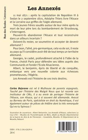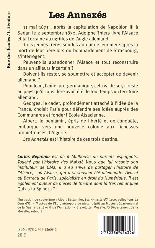11 mai 1871 : après la capitulation de Napoléon III à Sedan le 2 septembre 1870, Adolphe Thiers livre l’Alsace et la Lorraine aux griffes de l’aigle allemand. Trois jeunes frères soudés autour de leur mère après la mort de leur père lors du bombardement de Strasbourg, s’interrogent. Peuvent-ils abandonner l’Alsace et tout reconstruire dans un ailleurs incertain ? Doivent-ils rester, se soumettre et accepter de devenir allemand ? Pour Jean, l’aîné, pro-germanique, cela va de soi, il reste au pays qu’il considère avoir été de tout temps un territoire allemand. Georges, le cadet, profondément attaché à l’idée de la France, choisit Paris pour défendre ses idées auprès des Communards et fonder l’Ecole Alsacienne. Albert, le benjamin, épris de liberté et de conquête, embarque vers une nouvelle colonie aux richesses prometteuses, l’Algérie. Les Annexés est l’histoire de ces trois destins.