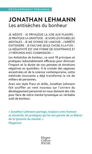 Les Antisèches du bonheur, ce sont 18 principes et pratiques redoutablement efficaces pour diminuer l'impact et la durée de nos pensées et émotions négatives au quotidien. À la croisée des sagesses ancestrales et de la science contemporaine, cette méthode innovante a déjà transformé la vie de milliers de personnes. Avec son style franc et drôle, Jonathan Lehmann fait souffler un vent nouveau sur l'univers du développement personnel en nous donnant des clés pour faire de notre mental tyrannique un véritable outil de bonheur.