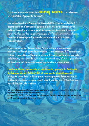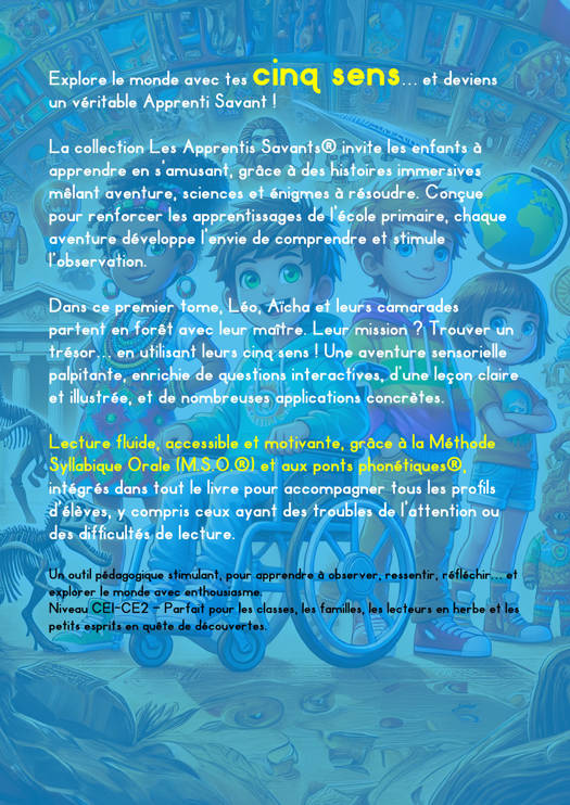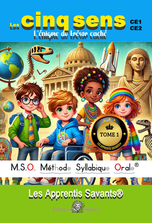Les Apprentis Savants® – Tome 1 : Les cinq sens – L’énigme du trésor caché Une aventure immersive et pédagogique pour les enfants du CE1 au CE2 Apprendre en s’amusant, c’est possible ! Ce livre mêle fiction, science, lecture fluide et aventure éducative dans un format idéal pour les enfants de 7 à 9 ans. Il permet de découvrir les cinq sens (la vue, l’ouïe, l’odorat, le goût, le toucher) à travers une histoire captivante, des énigmes à résoudre, et des activités d’observation. Dans ce premier tome de la collection Les Apprentis Savants®, les élèves partent en sortie avec leur maître. Mais cette promenade en forêt cache une surprise… Un trésor mystérieux à découvrir ! Pour le retrouver, les enfants devront mobiliser tous leurs sens et coopérer. À travers cette aventure sensorielle, ils apprendront à mieux connaître leur corps, à se repérer dans l’environnement et à utiliser leurs capacités d’analyse et de déduction. Contenu du livre : Une histoire vivante, adaptée aux enfants lecteurs de CE1 et CE2 Des personnages attachants, avec une représentation inclusive (fauteuil roulant, diversité culturelle) Une série de 30 questions interactives pour tester ses connaissances Une leçon complète et claire sur les cinq sens Des réponses commentées pour guider l’enfant dans sa compréhension Des illustrations en noir et un format accessible pour tous les profils Méthode Syllabique Orale (M.S.O.®) : Ce livre est conçu pour soutenir les enfants dans l’apprentissage de la lecture, y compris ceux porteurs de TDAH, de troubles dys ou en difficulté scolaire. Grâce à la M.S.O.® et aux ponts phonétiques®, l’enfant suit plus facilement le fil de la lecture, tout en renforçant ses automatismes. Ce livre est particulièrement adapté : Aux enseignants de CE1-CE2 souhaitant aborder les cinq sens de manière vivante