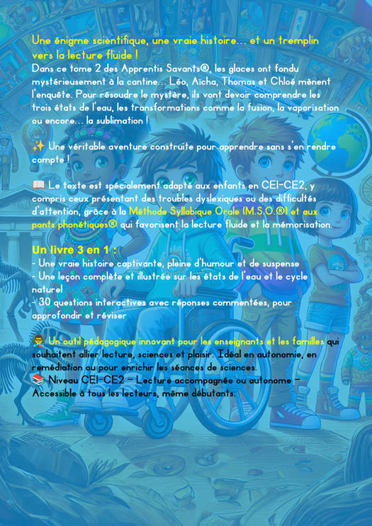 Les Apprentis Savants – Tome 2 : Les États de l’eau – L’énigme des glaces fondues Un livre de lecture fluide, accessible aux enfants dyslexiques, qui mêle aventure, science et plaisir d’apprendre.