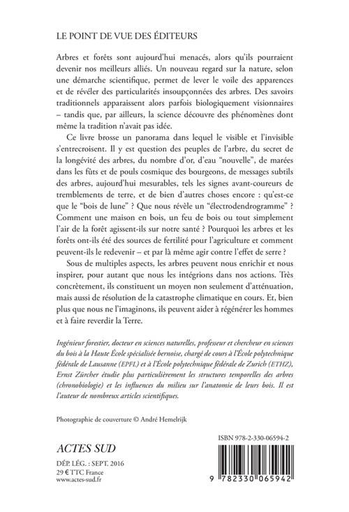 Ce livre brosse un panorama dans lequel le visible et l'invisible s'entrecroisent. Il y est question des peuples de l'arbre, du secret de la longévité des arbres, du nombre d'or, d'eau "nouvelle", de marées dans les fûts et de pouls cosmique des bourgeons, de messages subtils des arbres, aujourd'hui mesurables, tels les signes avant-coureurs de tremblements de terre, et de bien d'autres choses encore : qu'est-ce que le "bois de lune" ? Que nous révèle un "électrodendrogramme" ? Comment une maison en bois, un feu de bois ou tout simplement l'air de la forêt agissent-ils sur notre santé ? Pourquoi les arbres et les forêts ont-ils été des sources de fertilité pour l'agriculture et comment peuvent-ils le redevenir - et par là même agir contre l'effet de serre ?