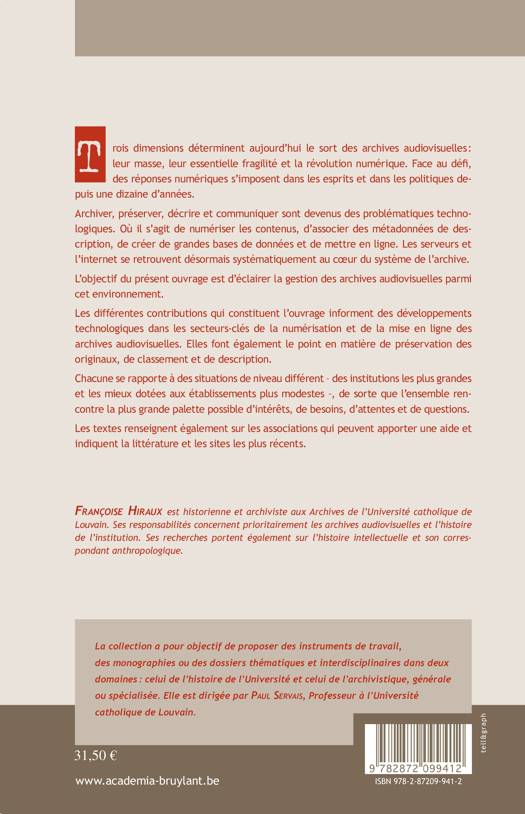 Trois dimensions déterminent aujourd'hui le sort des archives audiovisuelles : leur masse, leur essentielle fragilité et la révolution numérique. L'ouvrage informe des développements technologiques et fait le point en matière de préservation, de classemen