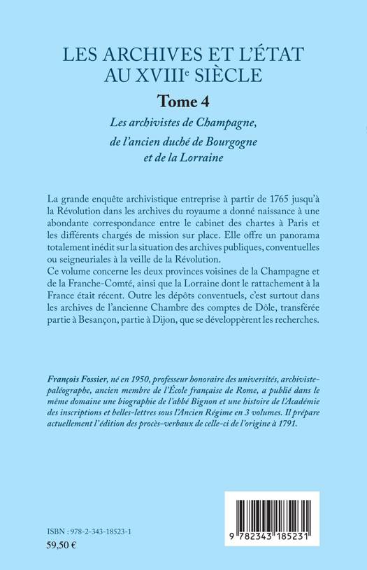 les différents chargés de mission sur place. Elle offre un panorama totalement inédit sur la situation des archives publiques, conventuelles ou seigneuriales à la veille de la Révolution. Ce volume concerne les deux provinces voisines de la Champagne et de la Franche-Comté, ainsi que la Lorraine dont le rattachement à la France était récent. Outre les dépôts conventuels, c'est surtout dans les archives de l'ancienne Chambre des comptes de Dôle, transférée partie à Besançon, partie à Dijon, que se développèrent les recherches.