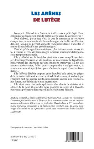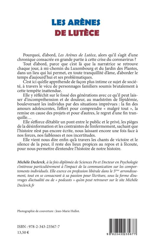 Pourquoi, d'abord, Les Arènes de Lutèce, alors qu'il s'agit d'une chronique consacrée en grande partie à cette crise du coronavirus ? Tout d'abord, parce que c'est là que la narratrice se retrouve chaque jour, à mi-chemin du Luxembourg et du Jardin des Plantes, dans un lieu qui lui permet, en toute tranquillité d'âme, d'aborder le temps d'aujourd'hui et ses problématiques. Elle s'efforce d'établir un pont entre le public et le privé, les pièges de la désinformation et les contraintes de l'enfermement, sachant que l'histoire n'est pas encore écrite, nous laissant encore une fois face à nos forces, nos faiblesses et nos incertitudes. Elle vient nous dire enfin qu'à travers les chants de victoire et le silence de la peur, il reste des lieux propices au repos et à l'écoute, pour nous permettre d'entendre l'histoire de notre histoire.