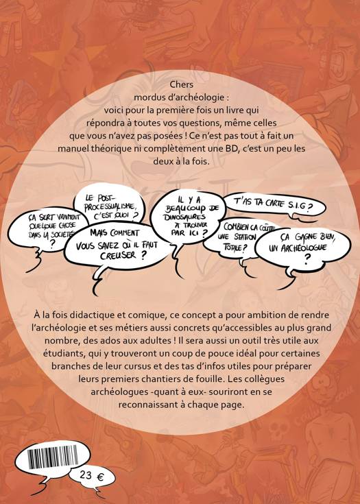 Chers mordus d’archéologie : voici pour la première fois un livre qui répondra à toutes vos questions, même celles que vous n’avez pas posées ! Ce n’est pas tout à fait un manuel théorique ni complètement une BD, c’est un peu les deux à la fois. À la fois didactique et comique, ce concept a pour ambition de rendre l’archéologie et ses métiers aussi concrets qu’accessibles au plus grand nombre, des ados aux adultes ! Il sera aussi un outil très utile aux étudiants, qui y trouveront un coup de pouce idéal pour certaines branches de leur cursus et des tas d’infos utiles pour préparer leurs premiers chantiers de fouille. Les collègues archéologues -quant à eux- souriront en se reconnaissant à chaque page. Pour tout ceux qui veulent découvrir l’archéologie tout en souriant.