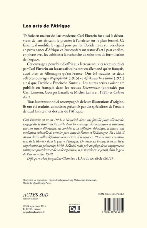 Cet ouvrage a pour but d'offrir aux lecteurs tous les textes publiés par Carl Einstein sur les arts africains tant en allemand qu'en français, aussi bien en Allemagne qu'en France. Ont été traduits les deux célèbres ouvrages «Negerplastik» (1915) et «Afrikanische Plastik» (1921) ainsi que l'article « Exotische Kunst ». Les autres écrits avaient été publiés en français dans les revues Documents (cofondée par Carl Einstein, Georges Bataille et Michel Leiris en 1929) et «Cahiers d'art».