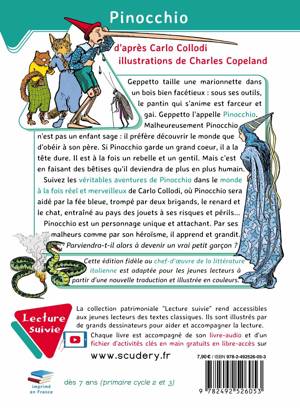 Édition illustrée et abrégée de Pinocchio, le chef-d’œuvre de la littérature italienne : un jour, Geppetto taille une marionnette dans un bois bien facétieux ; sous ses outils, le pantin qui s'anime est farceur et gai. Geppetto l'appelle Pinocchio. Malheureusement Pinocchio n’est pas un enfant sage : il préfère découvrir le monde que d'obéir à son père. Si Pinocchio garde un grand cœur, il a la tête dure. Il est à la fois un rebelle et un gentil. Mais c’est en faisant des bêtises qu'il deviendra de plus en plus humain. Suivez les véritables aventures de Pinocchio dans le monde à la fois réel et merveilleux de Carlo Collodi, où Pinocchio sera aidé par la fée bleue, trompé par deux brigands, le renard et le chat, entraîné au pays des jouets à ses risques et périls… Pinocchio est un personnage unique et attachant. Par ses malheurs comme par son héroïsme, il apprend et grandit. Parviendra-t-il alors à devenir un vrai petit garçon ? Cette édition fidèle au récit est adaptée pour les jeunes lecteurs à partir d'une nouvelle traduction et illustrée en couleurs par Charles Copeland.