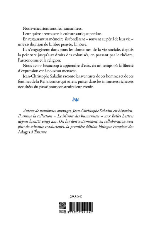 Nos aventuriers sont les humanistes. Leur quete: retrouver la culture antique perdue. En restaurant sa memoire, ils fonderent - souvent au peril de leur vie - une civilisation de la libre pensee, la notre. Ils s'engagerent dans tous les domaines de la vie sociale, depuis la peinture jusqu'aux droits des colonises, en passant par le theatre, l'astronomie et la religion. Nous avons beaucoup a apprendre d'eux, en un temps ou la liberte d'expression est a nouveau menacee. Jean-Christophe Saladin raconte les aventures de ces hommes et de ces femmes de la Renaissance qui surent puiser dans les immenses richesses occultees du passe pour construire leur avenir.