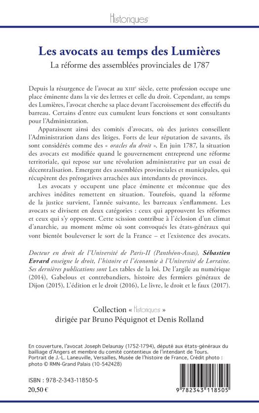 L'ouvrage évoque le rôle des avocats au temps des Lumières, en s'appuyant sur la réforme emblématique de 1787-1788 liée à la décentralisation du royaume de France. À ce moment, l'histoire bascule : les avocats se scindent en deux blocs, l'un appuyant la réforme ; l'autre s'y opposant. De cette coupure naîtront des conflits, et la réunion des états-généraux de 1789 va ouvrir un autre chapitre de l'histoire de France, avec la Révolution française.