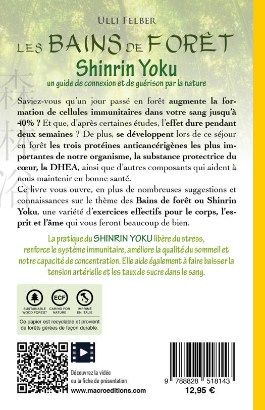 Ce livre vous ouvre, en plus de nombreuses suggestions et connaissances sur le thème des Bains de forêt ou Shinrin Yoku, une variété d’exercices effectifs pour le corps, l’esprit et l’âme qui vous feront beaucoup de bien.
