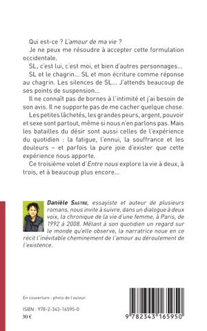 Qui est-ce ? L'amour de ma vie ? Je ne peux me résoudre à accepter cette formulation occidentale. SL, c'est lui, c'est moi, et bien d'autres personnages... SL et le chagrin... SL et mon écriture comme réponse au chagrin. Les silences de SL... J'attends beaucoup de ses points de suspension... Il ne connaît pas de bornes à l'intimité et j'ai besoin de son avis. Ce troisième volet d'Entre nous explore la vie à deux, à trois, et à beaucoup plus encore...