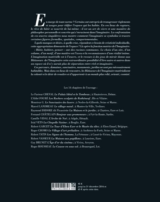En marge de toute norme ? Certains ont entrepris de transgresser reglements et usages pour edifier l'espace qui les habite. En ces lieux de rupture, le reve de batir se nourrit de lui-meme: il est un art de vivre et une maniere de philosopher personnelle et concrete qui s'enracinent dans l'imaginaire. La confrontation de ces oeuvres singulieres nous montre comment l'imaginaire se symbolise a travers certaines figures formelles, spatiales, comportementales. A quels manques et desirs, a quelle crise, repondent ce besoin de creativite individuelle, cette appropriation demesuree de l'espace ? La opere la fonction motrice de l'Imaginaire. Batir, habiter, penser ont des racines communes. Le choix d'un site, d'un volume, d'un motif, d'une matiere est l'aveu et la reconnaissance d'une realite intime. L'imagination materielle est a l'oeuvre, et le recours a des jeux de miroir donne aux Batisseur de l'Imaginaire cette extraordinaire possibilite d'etre autre et autres dans un espace ou il n'y aurait plus de separation entre reel et imaginaire. Ces parcours, domaines, sanctuaires, monuments, jardins ne sont pas necessairement habitables. Mais dans ces lieux de rencontre, les Batisseurs de l'Imaginaire materialisent la volonte et le desir de renaitre et d'appartenir a un monde plus relie, oriente, cosmise.