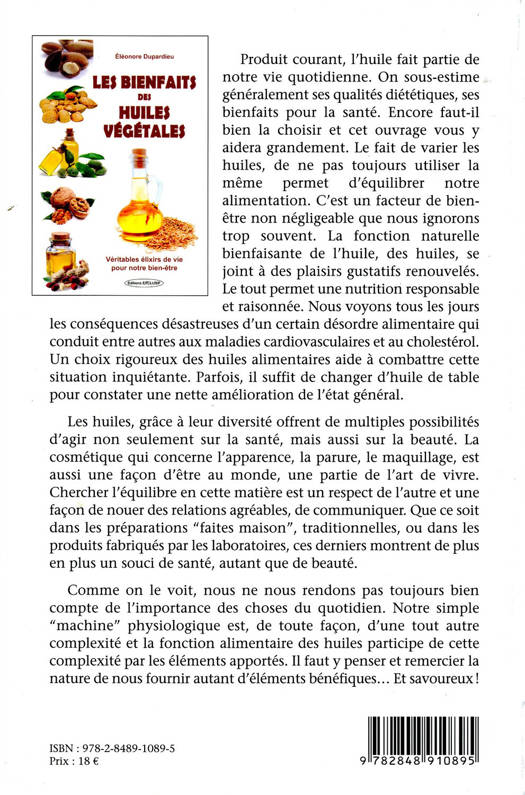 Produit courant, l'huile fait partie de notre vie quotidienne. On sous-estime généralement ses qualités diététiques, ses bienfaits pour la santé. Encore faut-il bien la choisir et cet ouvrage vous y aidera grandement. Le fait de varier les huiles, de ne pas toujours utiliser la même permet d'équilibrer notre alimentation. C'est un facteur de bien-être non négligeable que nous ignorons trop souvent. La fonction naturelle bienfaisante de l'huile, des huiles, se joint à des plaisirs gustatifs renouvelés. Le tout permet une nutrition responsable et raisonnée. Nous voyons tous les jours les conséquences désastreuses d'un certain désordre alimentaire qui conduit entre autres aux maladies cardiovasculaires et au cholestérol. Un choix rigoureux des huiles alimentaires aide à combattre cette situation inquiétante. Parfois, il suffit de changer d'huile de table pour constater une nette amélioration de l'état général. Les huiles, grâce à leur diversité offrent de multiples possibilités d'agir non seulement sur la santé, mais aussi sur la beauté. La cosmétique qui concerne l'apparence, la parure, le maquillage, est aussi une façon d'être au monde, une partie de l'art de vivre. Chercher l'équilibre en cette matière est un respect de l'autre et une façon de nouer des relations agréables, de communiquer. Que ce soit dans les préparations "faites maison", traditionnelles, ou dans les produits fabriqués par les laboratoires, ces derniers montrent de plus en plus un souci de santé, autant que de beauté. Comme on le voit, nous ne nous rendons pas toujours bien compte de l'importance des choses du quotidien. Notre simple "machine" physiologique est, de toute façon, d'une tout autre complexité et la fonction alimentaire des huiles participe de cette complexité par les éléments apportés. Il faut y penser et remercier la nature de nous fournir autant d'éléments bénéfiques, et savoureux !